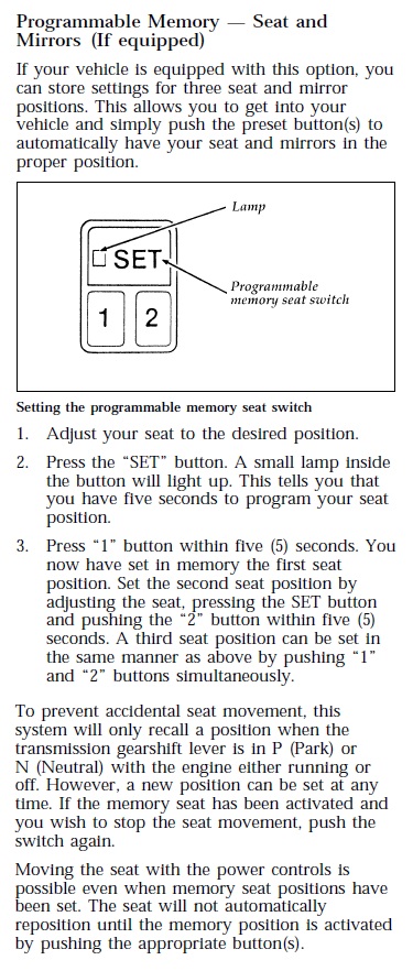 Click here for a scan of the original memory seat instructions from the 1995-1997 user manual.